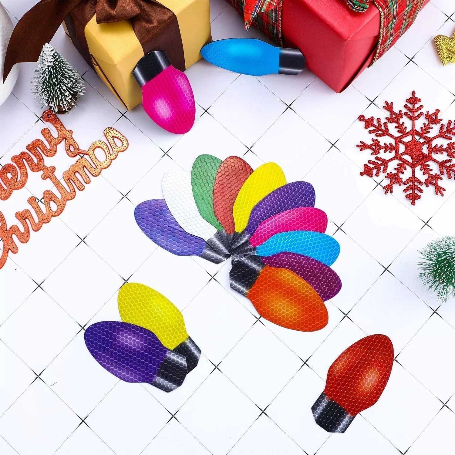 Hergestellt aus reflektierender Folie und magnetischer Rückseite. Diese reflektierenden Glühbirnenmagnete scheinen zu leuchten, wenn sie von Scheinwerfern angestrahlt werden. Sie leuchten wie echte Glühbirnen im Sonnenlicht oder in der Beleuchtung. So können Sie Ihr Auto für die Feiertage verschönern.