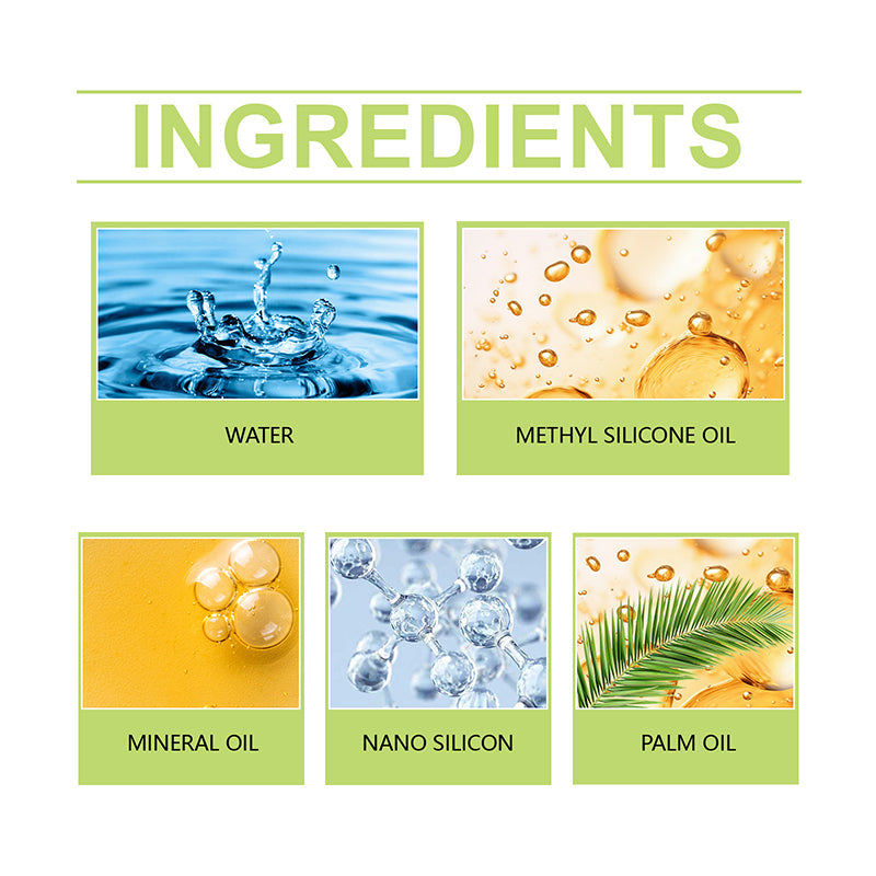 Hauptbestandteile: Wasser, Nanosilikon, Methylsilikonöl, Mineralöl, Palmöl usw.